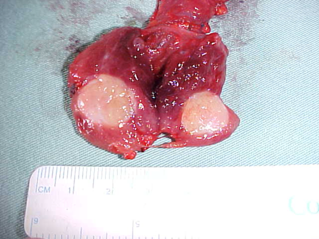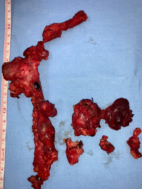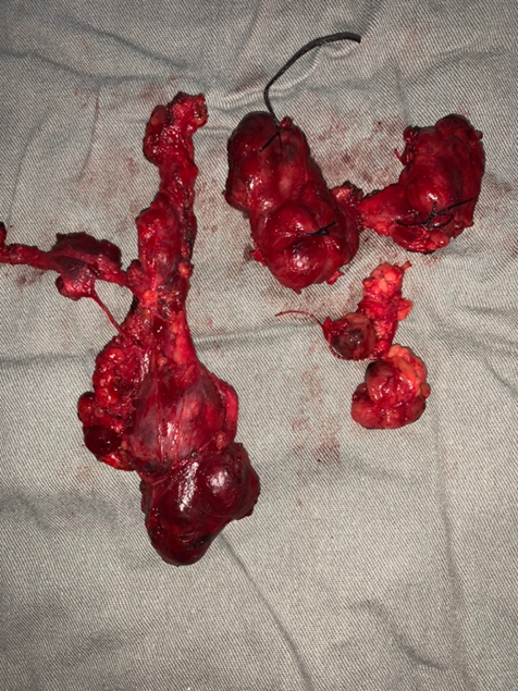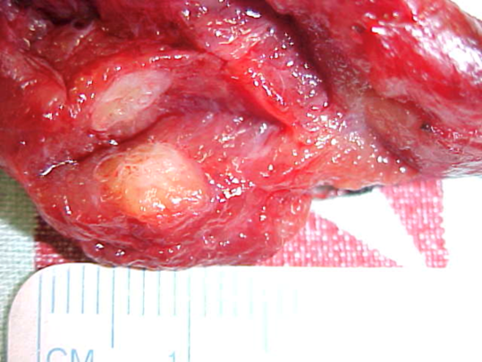 Abaixo, um tumor papilífero e suas metástases … Percebam que em ambos os dois casos ilustrados abaixo, apesar de termos muitas metástases, todas foram retiradas. Deste modo, a chance de cura, quase não se altera. Portanto, se houver metástase (filhotes) no pescoço e estes forem retirados, a chance de cura ainda é muito alta
