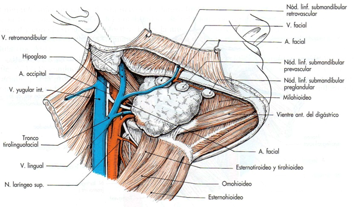As glândulas submandibulares, em número de dois, uma de cada lado da face, localizadas logo abaixo da mandíbula (osso que faz o contorno inferior da face e o queixo) são a segunda maior estrutura produtora de saliva que temos, sendo responsáveis por grande parte da origem dela.