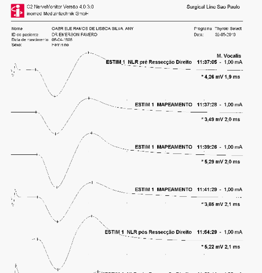 Em qualquer um dos acessos, seja tradicional (pelo pescoço), Vestibular (boca) ou robótico, eu sempre uso a monitorização dos nervos da tireoide. Este recurso, evita, que o paciente saia da cirurgia com as duas cordas vocais funcionando com uma intensidade menor do que antes da cirurgia e evita o uso da traqueostomia. Para isso, “testamos” o nervo durante o procedimento usando uma pequena canta que estimula o nervo e desta forma, mostra um gráfico com valores medidos que são comparados ao termino do primeiro lado da cirurgia. Desta forma, analiso se prossigo ou não com a retirada do outro lado